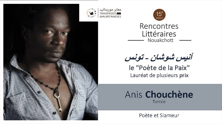 Poète et slameur, Anis Chouchène né en 1982 est surnommé le "Poète de la Paix". Du Soudan au Bahreïn, de l’Europe à l’Amérique et les Émirats arabes, son arabe littéraire mâtiné au dialecte tunisien séduit par ses mots envoutants. Lauréat de plusieurs prix, en faveur de sociétés justes, il publie en 2023 Ana Anta أنا أنت" " aux éditions Hikaya au Koweït. Ses textes, traduits en plusieurs langues, sont étudiés dans des universités au Sénégal, en Algérie et en Malaisie.